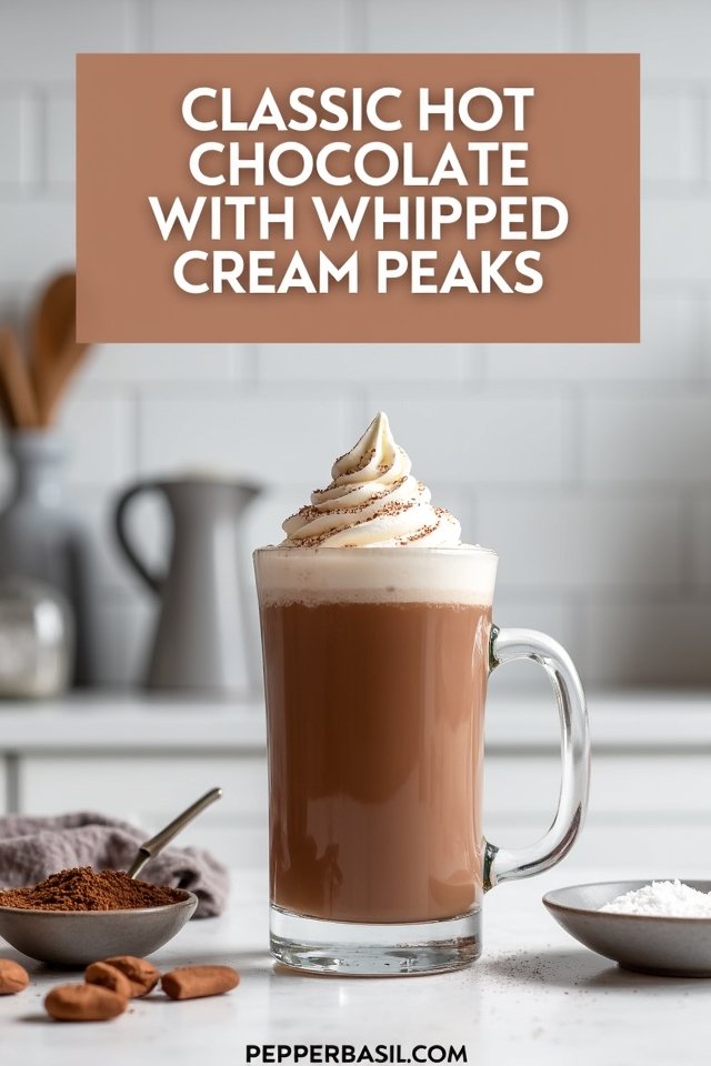 A rich and creamy hot chocolate topped with fluffy homemade whipped cream peaks.